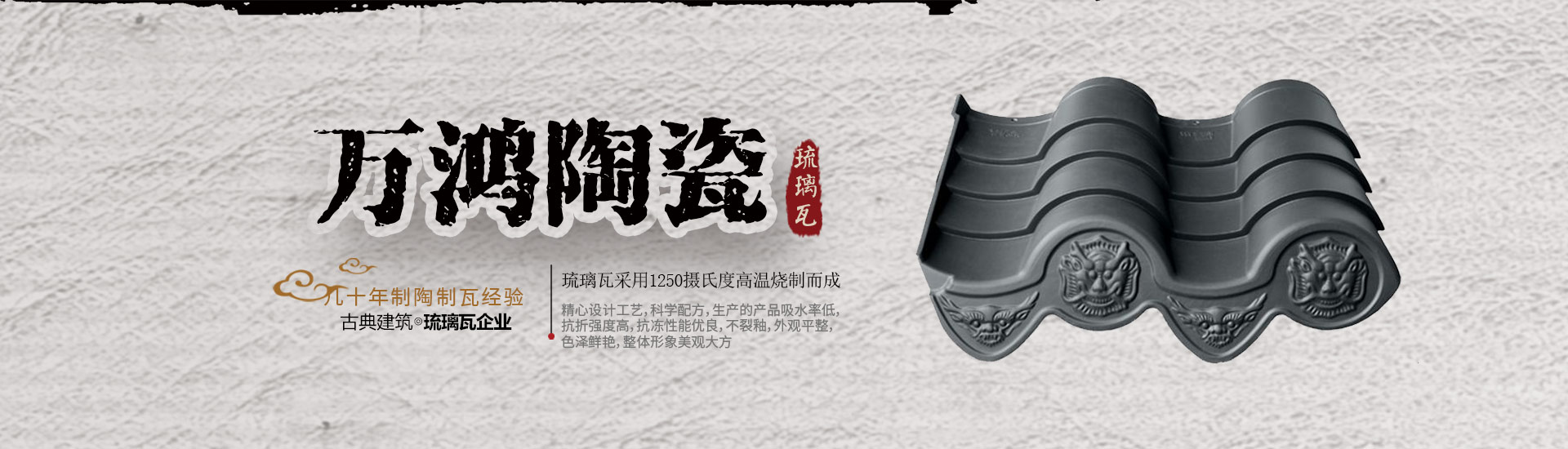 宜興市萬鴻陶瓷有限公司是國內生產古建琉璃瓦企業,也是宜興市琉璃瓦行業龍頭骨干企業。琉璃瓦采用1250攝氏度高溫燒制而成,公司座落經濟發達的宜興市丁山鎮,臨近寧杭高速公路、新長鐵路、錫宜高速和104國道,交通十分便利。  萬鴻陶瓷擁有幾十...